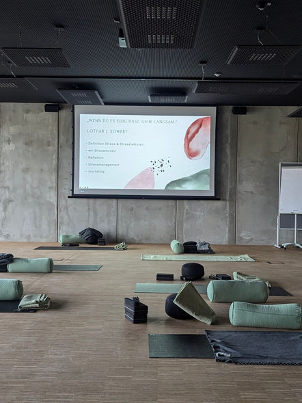 Entspannungs-, Meditations- und Atemtechniken erlernen, um sie im Berufsalltag zu integrieren (Progressive Muskelentspannung, Body Scan, Autogenes Training, Kurzentspannungstechniken, Mantra-Meditation, Atemmeditation, Ausdehnungsmeditation, Wechselatmung, tiefe Bauchatmung etc.)